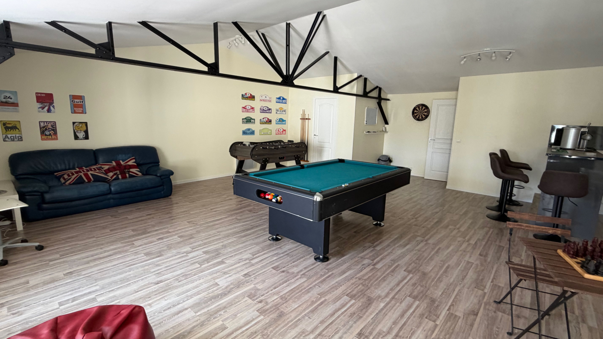Salle de sport, espace salon/bar, buanderie, garage, dépendance/grand atelier et parking couvert.