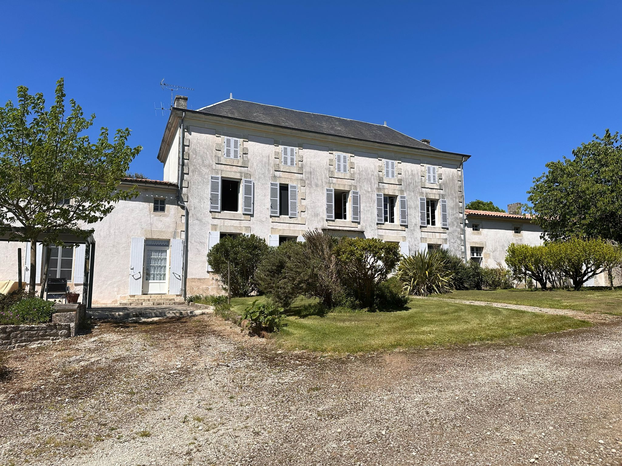 Ce logis charentais impose sa belle présence, ceint de murs il est à l'abri des regards et offre ainsi un lieu privilègié pour le repos, la tranquilité mais aussi pour l'accueil et la convivialité ou encore des projets plus profesionnels de bien être ou autres... Ses grandes dépendances de qualité maison à rénover attenante, grand chai attenant, grange avec mezzanine, ancienne bergerie, hangar et garage ouvrent égalerment des perspectives à discrétion.