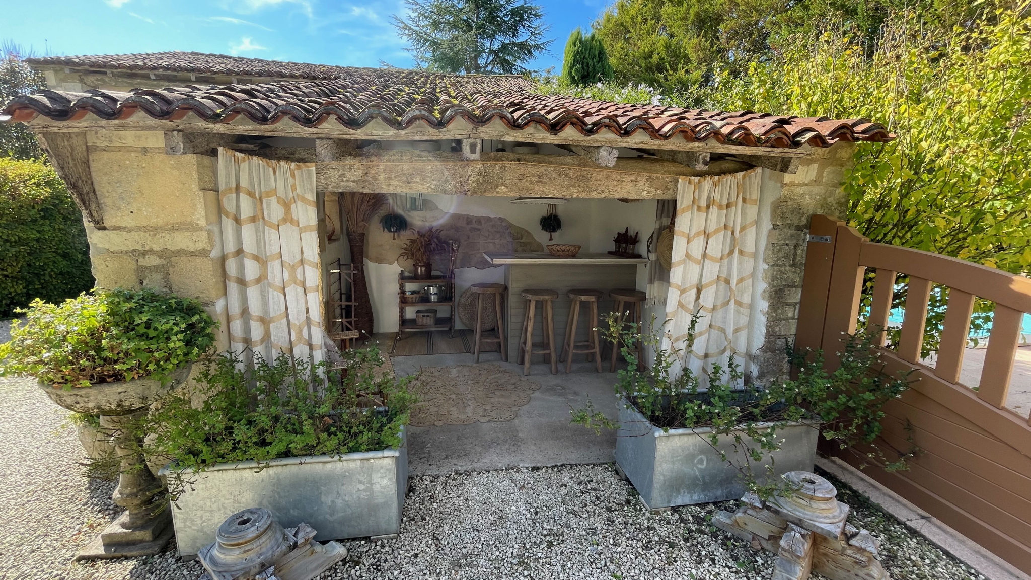 Le manoir, accessible par un portail électrique et une longue allée arborée, mène à un jardin paysager architectural avec cheminée en pierre, coin salon et bar au bord de la piscine.