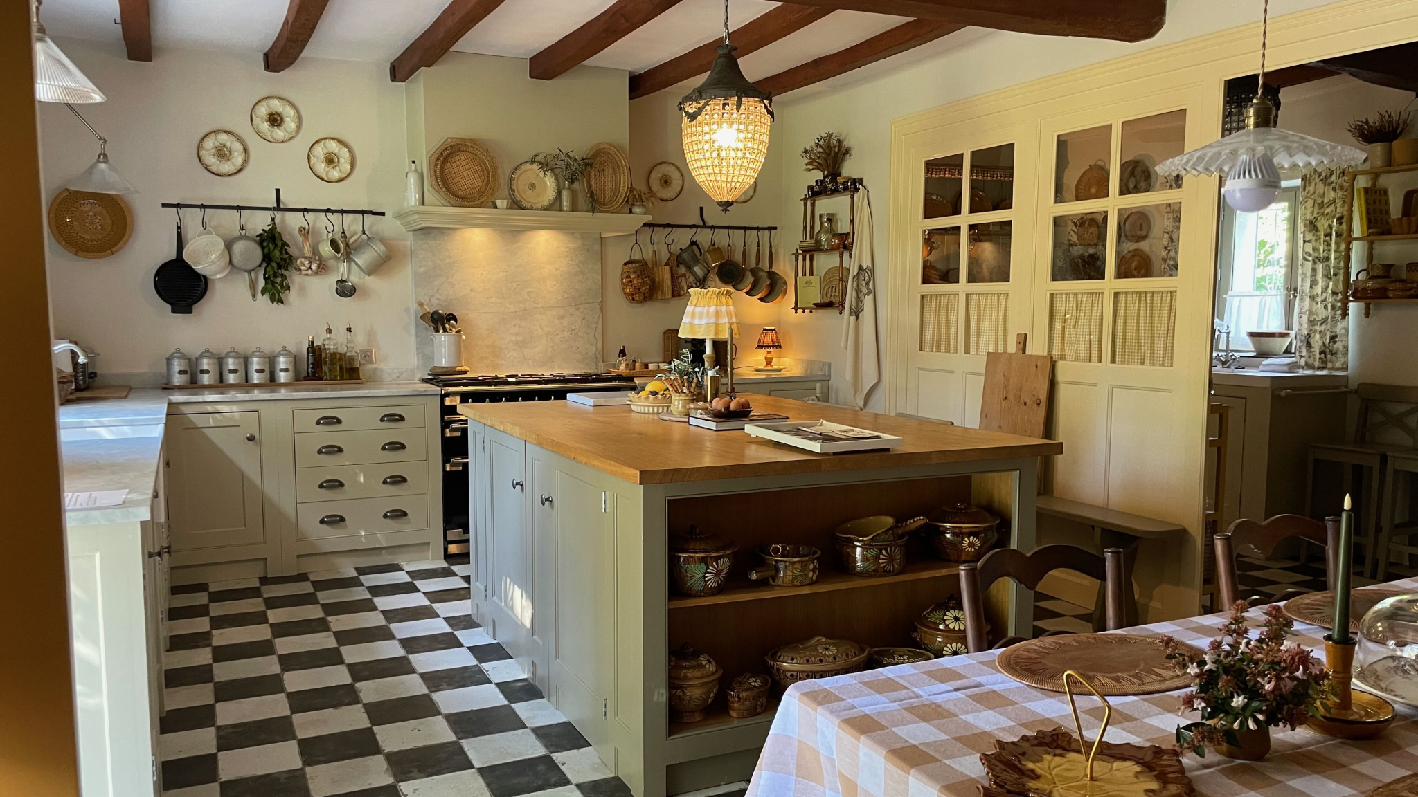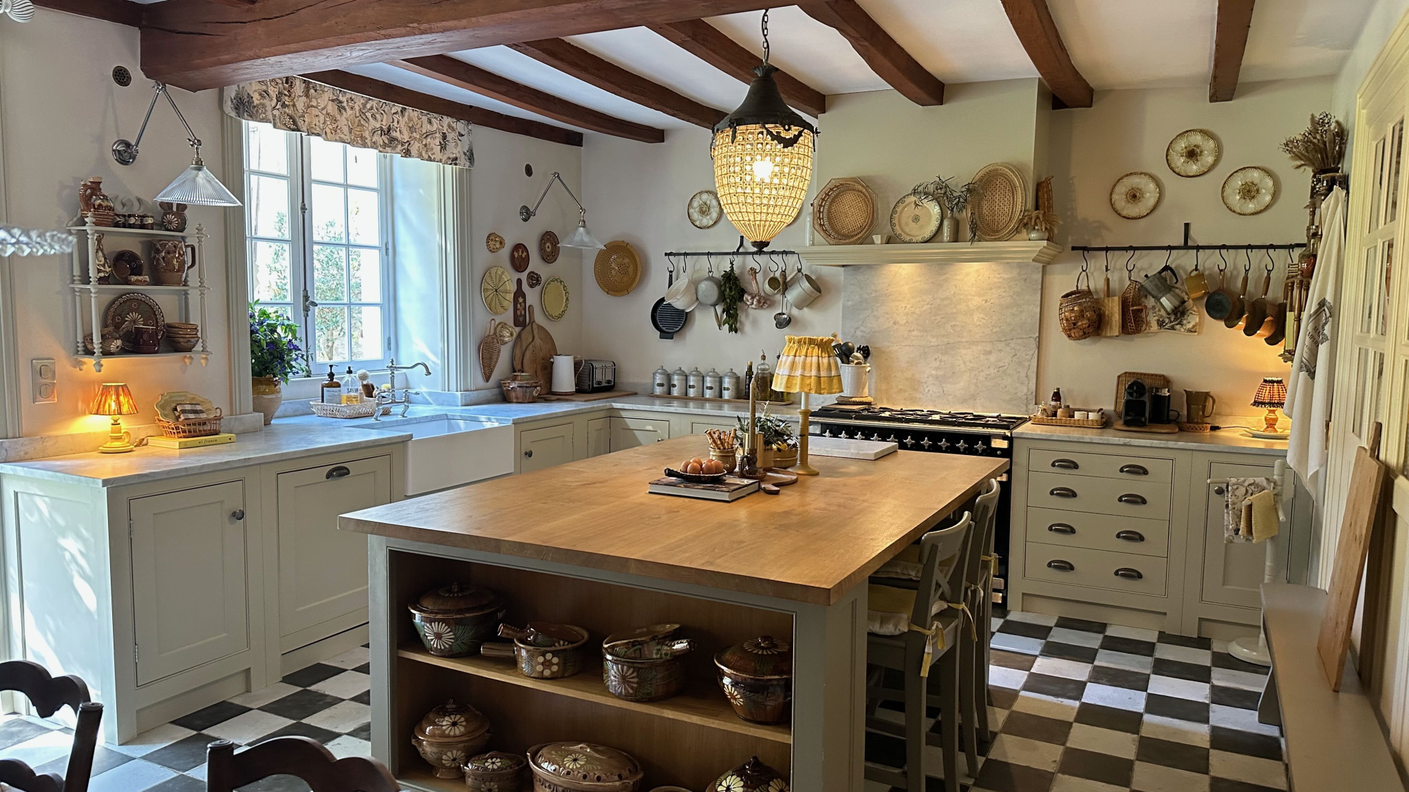 La restauration comprend une cuisine sur mesure avec des plans de travail en marbre de Carrare, un grand îlot central en chêne et une cuisinière Falcon.