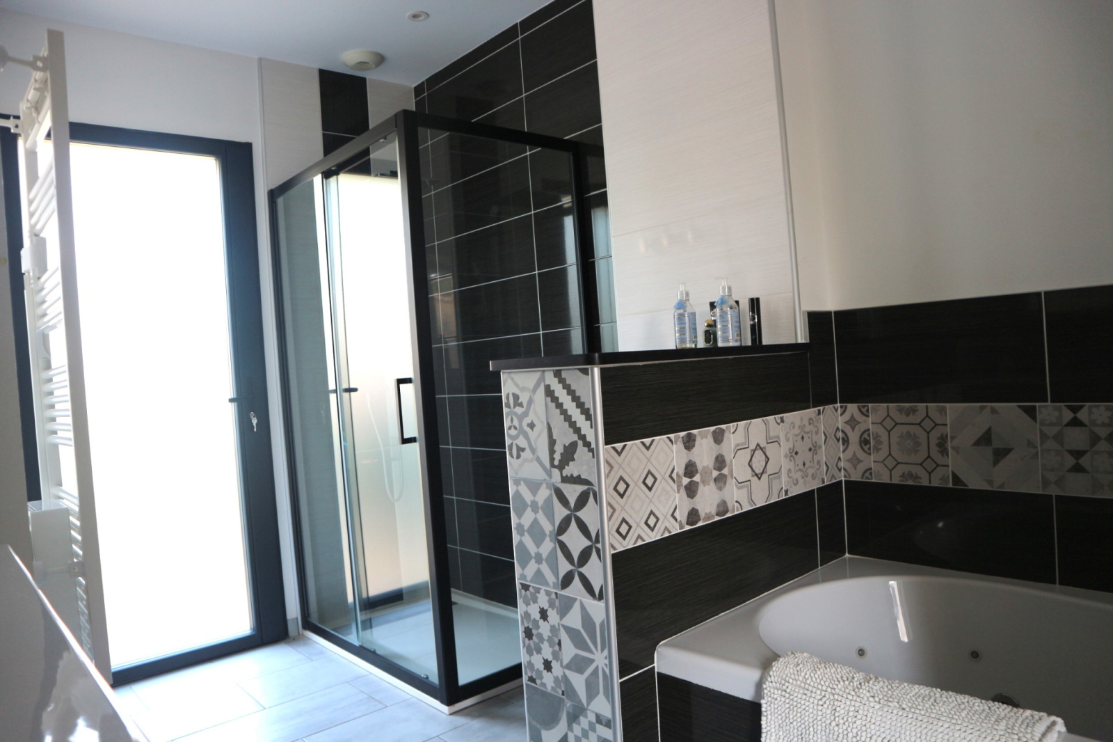 Elle est équipée de fenêtres pvc et alu double vitrage avec volets alu isolés (baie à galandage dans le séjour) donnant sur un grand jardin joliment aménagé et fleuri et une terrasse en pierre de 100m2.